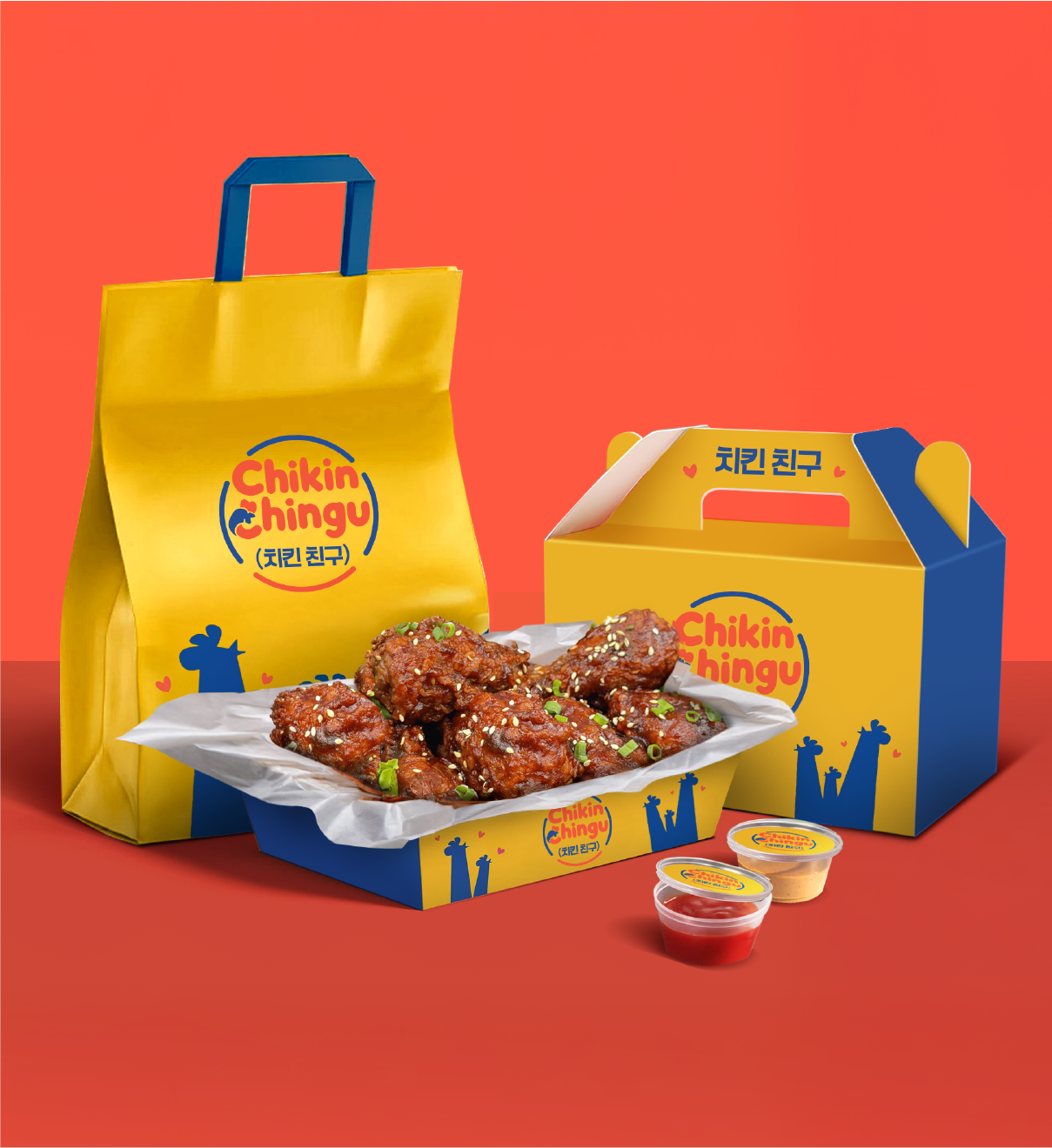 Chikin Chingu (치킨 친구) meaning "Chicken Friend" in Korean, features playful, bold packaging that