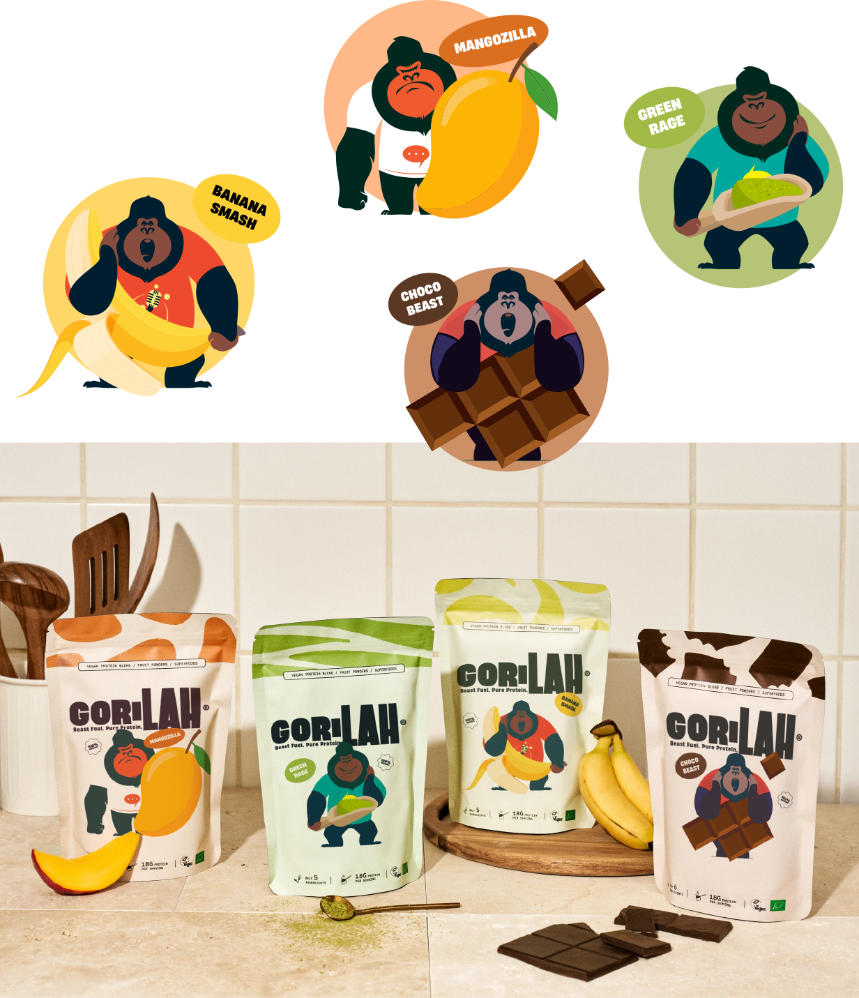 with a beast-mode attitude and local flair. Each flavor is led by its own illustrated gorilla character,